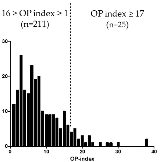 A single peak wave was found in the distribution of OP index values in the study population. The patients with the top 10% OP index value (n = 25) had at least 17 ossified lesions (Figure 1). These cases were defined as the high OP index group, and the remaining patients (n = 211) in whom the OP index was ≤16 were defined as the moderate/low OP index group.