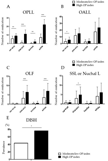 Radiologic findings, including OPLL (A), OALL (B), OLF (C), SSL or nuchal ligament (D), and DISH (E) in the high OP-index group and moderate/low OP-index group. DISH, diffuse idiopathic skeletal hyperostosis; OALL, ossification of the anterior longitudinal ligament; OLF, ossification of the ligamentum flavum; OPLL, ossification of the posterior longitudinal ligament; SSL, supra- and interspinous ligaments * p < 0.05, ** p < 0.01, *** p < 0.001.