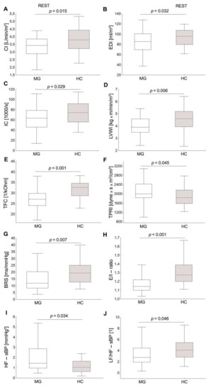 Scatter box plot showing the median, minimum and maximum values of CI, cardiac index (A); EDI, end-diastolic index (B); IC, index of contractility (C); LVWI, left ventricular work index (D); TFC, thoracic fluid content (E); TPRI, total peripheral resistance index (F); BRS, baroreflex sensitivity (G); E/I-ratio, expiration/inspiration ratio (H); (I) HF-sBP, high frequency of systolic blood pressure variability; LF/HF-sBP, the ratio between low and high band for systolic blood pressure variability (J) in MG group; respectively for compared to HCs.