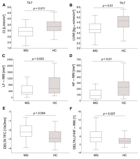 Scatter box plot showing the median, minimum and maximum values of CI, cardiac index (A); LVWI, left ventricular work index (B); LF-RRI, low frequency of heart rate variability (C); HF-RRI, high frequency of heart rate variability (D); TFC, thoracic fluid content (E); LF/HF-RRI, ratio between low and high band for heart rate variability (F) in MG group; respectively for compared to HCs.