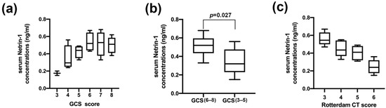 Comparing serum Netrin-1 concentrations in patients with different Glasgow Coma Scale scores, our study showed that patients with lower GCS scores had lower serum Netrin-1 levels (Figure 1a). Comparing serum Netrin-1 concentrations in patients with severe vs. critical GCS score, we found that the serum Netrin-1 concentrations of patients in the critical TBI group (GCS 3–5 points) was significantly lower than that in the severe TBI group (GCS 6–8 points) (Figure 1b). In addition, we performed Rotterdam CT scores on patients based on imaging findings. Comparing serum Netrin-1 concentrations in patients with different Rotterdam CT scores, we found that patients with higher scores had lower serum Netrin-1 concentrations (Figure 1c).