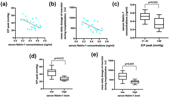Figure 2a showed the relationship between serum Netrin-1 concentrations and ICP peak among patients. Figure 2b showed the relationship between serum Netrin-1 concentrations and average mannitol consumption during hospitalization. According to the postoperative ICP peak, we divided the patients into moderately high ICP group (ICP 21–40 mmHg) and severe high ICP group (ICP > 40 mmHg). In the study, a total of 11 patients had severe ICP elevation (47.83%). Comparing serum Netrin-1 concentrations in patients with moderately high ICP vs. severe high ICP, we found that the serum Netrin-1 concentrations of patients in the severe high ICP group was significantly lower than that in the moderately high ICP group (Figure 2c). After grouping patients according to Netrin-1 levels and comparing ICP peak and average mannitol consumption in patients with high serum Netrin-1 level vs. low serum Netrin-1 level, we found that the ICP peak and average mannitol consumption in the high Netrin-1 group were significantly lower than those in the low Netrin-1 group (Figure 2d,e). Grouping both Netrin-1 levels and ICP peak simultaneously and comparing ICP level in patients with high Netrin-1 level vs. low Netrin-1 level, we found that 10% of patients in the high Netrin-1 group had severe ICP elevations (ICP > 40 mmHg) and 90% had moderate ICP elevations (ICP 21–40 mmHg). In the low Netrin-1 group, 76.92% of patients had severe ICP elevation (ICP > 40 mmHg) and 23.08% had moderate ICP elevation (ICP 21–40 mmHg) (Table 3).
