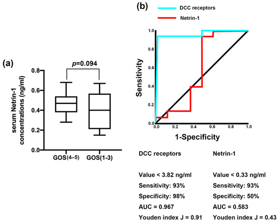 The results in Figure 5b showed the ability of DCC receptor concentrations and serum Netrin-1 concentrations to discriminate GOS levels. DCC receptor concentrations below 3.82 ng/mL predicted poor prognosis with a sensitivity of 93%, a specificity of 98% and a Youden J index of 0.91. Serum Netrin-1 concentrations below 0.33 ng/mL predicted poor prognosis with a sensitivity of 93%, a specificity of 50% and a Youden J index of 0.43. Based on the area under ROC curve (AUC), the ability of DCC receptor concentrations to predict prognosis was better than that of serum Netrin-1 concentrations.