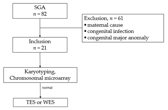 In our study of SGA infants without known risk factors, the prevalence of pathological chromosomal or subchromosomal abnormalities was 22% (5/21), similar to the previous report. However, caution should be excised in the interpretation because our study included only SGA without known etiology. As a result, the diagnostic yield of TES or WES in SGA infants was 3/19 (15.7%).