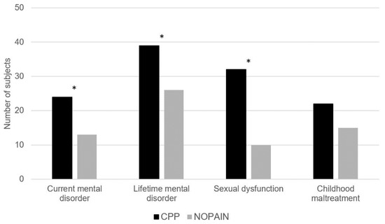 Rates of a current mental disorder (p = 0.019, odds ratio OR = 2.63), a lifetime mental disorder (p = 0.006, OR = 3.27), current sexual dysfunction (p < 0.001, OR = 7.11) and childhood maltreatment (CM) without the subscales physical neglect and trivialization (p = 0.074, OR = 2.04) in the groups CPP and NOPAIN. * p < 0.05.