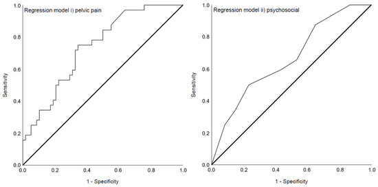Both regression analyses resulted in significant overall models (Table 3). The variance in the dependent variable current mental disorder explained by model i) pelvic pain (χ2 (3) = 14.27, p = 0.003) was 20.1% (Nagelkerke’s R2 = 0.201). The principal component resembling the need for pain relief (aOR = 4.08, p = 0.026) was a significant predictor in model i) and the area under the ROC curve (Figure 2) was 0.737 (95%-CI 0.635–0.840). Model ii) psychosocial (χ2 (3) = 7.89, p = 0.048) contributed to 11.3% (Nagelkerke’s R2 = 0.113) of the variance explanation of the dependent variable current mental disorder. Any current sexual dysfunction (aOR = 2.69, p = 0.031) was a significant predictor in this model and the area under the ROC curve (Figure 2) was 0.663 (95%-CI 0.548–0.778). Assessment of the assumption of no multicollinearity for both models is shown in Appendix B.