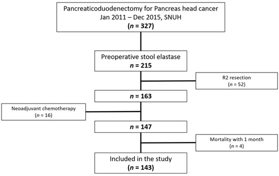 Between January 2011 and December 2015, 327 patients with pancreatic head cancer underwent PD at SNUH. Data on preoperative SE levels were available in 215 patients. In total, 52 patients who underwent palliative resection, 16 patients who underwent neoadjuvant chemotherapy, and 4 patients who died within 1 month were excluded (Figure 1). The mean age of the patients was 64.5 years; 87 patients were males and 56 were females. The median preoperative stool elastase level was 67.2 µg/g, and 111 patients had an SE level of <200 µg/g. Finally, 59 (41.3%) patients were classified in the high SE group (SE level ≥ 100 µg/g) and 84 (58.7%) were included in the low SE group (SE level < 100 µg/g), indicating severe PEI.