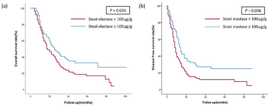 (a) The overall survival (OS) and (b) disease-free survival (DFS) of the patients according to the stool elastase group.