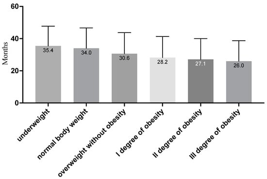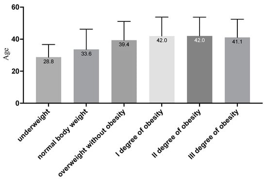 In the case of patients’ age, post hoc analysis with Scheffe’s correction showed that only between people with II and III degrees of obesity were there no differences for the average age; in other cases, the significance of differences between individual groups was p < 0.001. The highest average age was observed for people with obesity, while the lowest was observed for people with underweight or normal weight (see Figure 1).