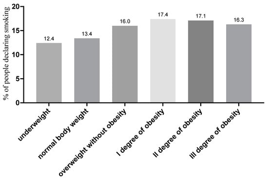 Percentage of people declaring smoking depending on the BMI category (due to the number of groups compared, results for differences are not shown in the figure).