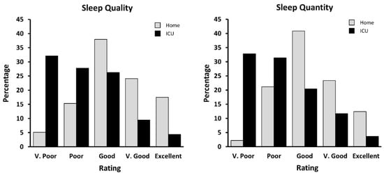 Self-reported sleep quality (left) and quantity (right) at home (grey) and while in the ICU (black).