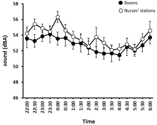 Sound levels (dB) in rooms (closed circles) and nurses’ stations (open circles) overnight. Error bars are SEM.