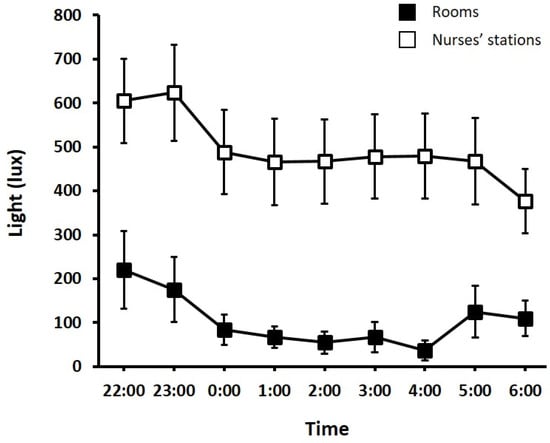 Light levels (lux) in rooms (closed squares) and nurses’ stations (open squares) overnight. Error bars are SEM.