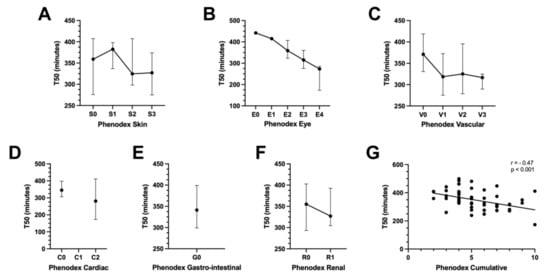 To evaluate the extent of disease severity in PXE patients, the Phenodex-FlorMore scoring system was used, revealing a median S (skin) score of 2 (IQR: 1.5–2), E (eye) score of 2 (2–3), V (vascular) score of 1 (0–1), C (cardiac) score of 0 (0–0) and R (renal) score of 0 (0–1). All patients had a G (gastrointestinal) score of 0. The median cumulative Phenodex score was five (4–7). Significant and strong associations with T50 were observed for the Phenodex E score (r = −0.47; p < 0.001), Phenodex V score (r = −0.38; p = 0.003) and Phenodex cumulative score (r = −0.47; p < 0.001) (Figure 2B,C,G).