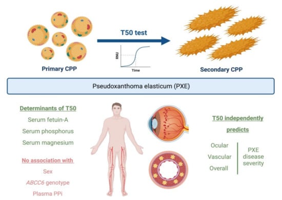Regarding a possible pathophysiological link between T50 and PXE disease severity, in vitro studies have shown that exposing vascular smooth muscle cells to secondary CPPs provokes a substantial inflammatory and procalcifying reaction, and increases oxidative stress [48,49]. As oxidative stress and increased cytokine production—as part of an overlapping process of excessive DNA damage response and premature senescence—have recently been shown to be involved in PXE pathogenesis, the dose-dependent damaging effects of secondary CPPs (as reflected by T50) might directly link T50 to the molecular process of PXE-related ectopic calcification [32,50].