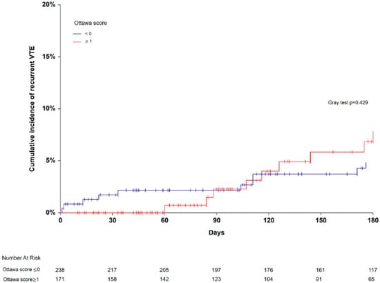 Statistical analysis was performed using NCSS 2022 (NCSS LLC, Kaysville, UT, USA) and R (https://www.R-project.org (accessed on 28 February 2022) with the “cmprisk,” and “riskRegression” packages. All analyses were conducted on the intention-to-treat population (i.e., all included patients). Missing data were imputed using single imputation by predictive mean matching. Categorical variables were compared using the chi-square test or Fisher’s exact test, and continuous variables were compared using the Mann–Whitney test. The Fine & Gray competing risk model, considering non-VTE-related death as a competing risk [22], was used to estimate the cumulative incidences of recurrent VTE in the high-risk and low-risk Ottawa score groups with their corresponding 95% CI. The individual variables included in the Ottawa score were assessed by estimating the subdistribution hazard ratios (SHRs) with 95% CI at 6 months in a multivariable model including all score variables. The overall discriminatory performance of the continuous Ottawa score to predict recurrent VTE at the 6-month follow-up was assessed by calculating the Area Under the Receiver Operating Characteristic curve (AUROC, Efron C-index) and its 95% CI. The variable of interest was the continuous Ottawa score, and the dichotomous outcome variable was recurrent venous thromboembolism within 6 months.