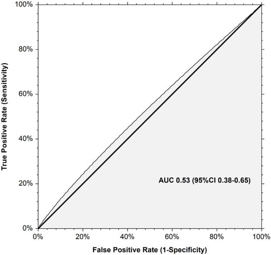 At study enrollment, 171 patients (41.8% (95% CI 37.0–46.6)) were classified at high-risk for recurrent VTE and 238 (58.2% (95% CI 53.4–63.0)) patients at low risk. Nine recurrent VTE occurred in the high-risk Ottawa score group versus ten in the low-risk Ottawa score group. Six-month cumulative incidences of recurrent VTE did not significantly differ between the high-risk and the low-risk Ottawa score groups (7.8% (95% CI 4.2–14.8) versus 4.8% (95% CI 2.6–8.9), Gray test p = 0.429; SHR 1.47 (95% CI 0.24–8.55) in competing risk analysis, p = 0.670; Figure 1). The AUROC of the Ottawa score was 0.53 (95% CI 0.38–0.65; Figure 2). At the cutoff point defining high-risk (sum score ≥1), the model sensitivity was 47.4% (95% CI 24.4–71.1), and its specificity was 58.5.6% (95% CI 53.3–63.4). The corresponding positive and negative predictive values were 5.3% and 98.8%, respectively. The proportion of patients correctly classified (accuracy) was 57.9%. Excluding CVC-related thrombosis from the recurrent VTE events did not change the AUROC of the Ottawa score.