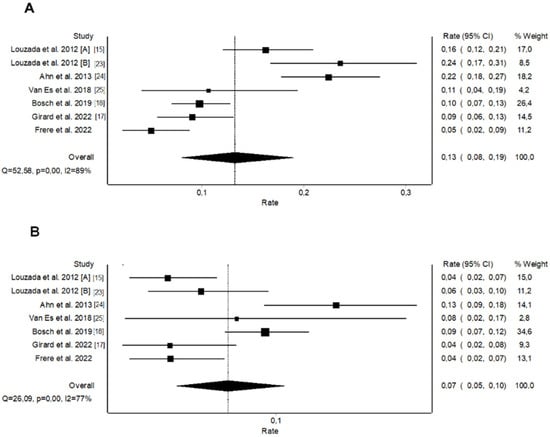 Pooled rates of recurrent venous thromboembolism for the original Ottawa score: (A) High-risk patients, (B) Low-risk patients.
