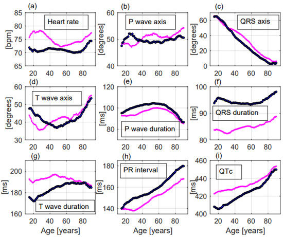 Figure 3. ECG changes with ageing of the considered parameters in females—and in males—Significant differences between females and males were observed for most of the ECG parameters (a–i). Especially heart rate and QTc were significantly greater in females (a,i) while QRS duration and PR interval were significantly greater in males (f,h).