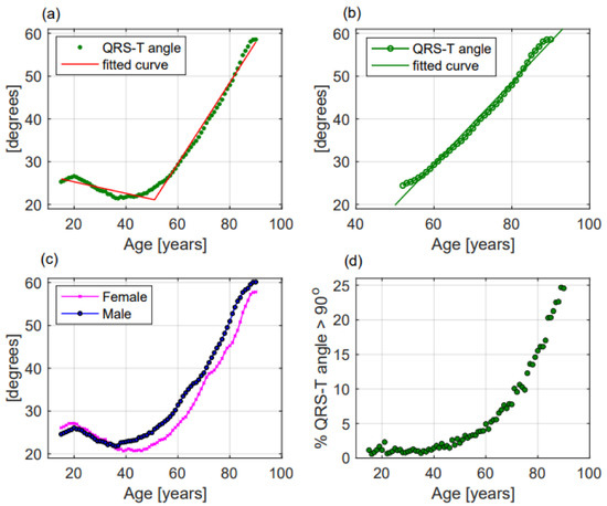 Figure 4. QRS-T angle modifications with ageing in the whole population (a), in patients older than 51.5 years (b), in females and males (c); and (d) percentage of patients with QRS-T angle greater than 90 deg according to age. In panels (a–c) dots represent mean values of QRS-T angle while in panel (d) green dots represent the percentage of patients with a QRS-T angle greater than 90 deg. In panels (a,b) lines represent the fitted curve.