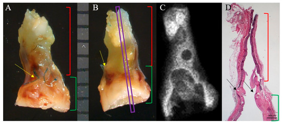 (A,B) Macroscopic images of the PAG and the near aorta 69 days after surgery. The PAG (green stapes) appeared more dilated than the infrarenal abdominal aorta (red stapes). Yellow and black arrows indicate the sutures. (C) Radiography of the explant: no calcifications were visible. (D) Histological image of the entire explant in correspondence to the purple section in (B); the same portions indicated in (A,B) are highlighted. Weigert-Van Gieson, original magnification 12.5×.