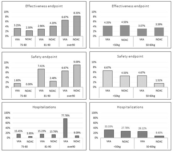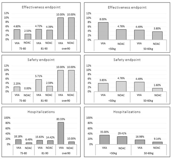 The NOAC group was more likely to have a higher BMI and a higher prevalence of history of stroke/TIA and insulin-dependent diabetes; conversely, heart failure and chronic hepatic disease were less frequent. No significant difference in follow-up duration between the two groups were found (369 ± 31 vs. 369 ± 12 days; p = 0.3). Among the overall population, 19 patients (4 in NOAC vs. 15 in VKA group) experienced MB events; a trend of reduction of MB overall incidence was reported among NOAC group compared to VKA group (1.78% vs. 4.73%; p = 0.06). A total of 18 patients (8 in the NOAC vs. 10 in the VKA group) experienced TE events; no significant difference in the overall incidence of TE events was shown between the two groups (3.6% vs. 3.2%, p = 0.79). Sixty-eight patients were hospitalized during the follow-up (21 in the NOAC vs. 47 in the VKA group); a trend of lower rate of hospitalizations was present in the NOAC group compared to the VKA group (9.3% vs. 14.8%; p = 0.06). A total of 7 patients (6 in the NOAC vs. 1 in the VKA group) died; no significant difference in the overall incidence of death was shown between the two groups (2.8% vs. 0.4%, p = 0.12). Figure 1 shows the outcome events stratified according to age (75–80 yrs.; 81–90 yrs.; and >90 yrs.) and weight (<50 kg and 50–60 kg). No statistically significant differences were found across the subgroups, except for a statistically significant lower rate of all-cause hospitalizations among patients with weight 50–60 kg (8.6% vs. 26.1%; p = 0.0004) and those over 90 years (9.1% vs. 77.8%; p = 0.004) for NOACs vs. VKAs.