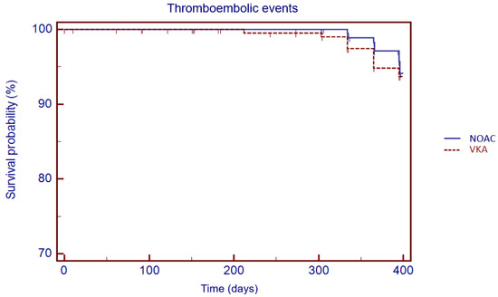 Kaplan–Meier cumulative probability of thromboembolic event-free survival in NOAC and VKA treatment group.