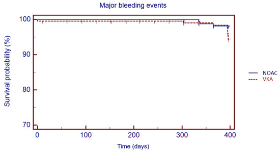 Kaplan–Meier cumulative probability of major bleedings event-free survival in NOAC and VKA treatment group.