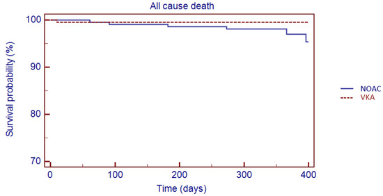 Kaplan–Meier cumulative probability of all-cause death event-free survival in NOAC and VKA treatment group.