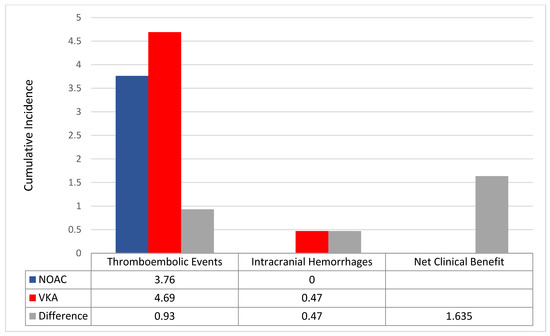 The NOAC group featured a positive net clinical benefit vs. VKAs (+1.6) between the two matched population (Figure 6).