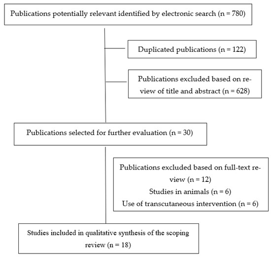 Our electronic search resulted in 780 potential studies being included in this scoping review. After removing duplicates (n = 122) and those not meeting the first filter (n = 628), the full view text of 30 studies was conducted. After extensive reading, 12 studies were excluded. Therefore, a total of eighteen (n = 18) studies [10,11,12,35,36,37,38,39,40,41,42,43,44,45,46,47,48,49] were included in the literature data mapping (Figure 1).