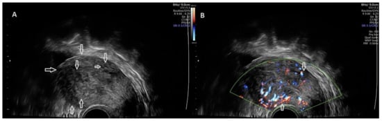 (A) B–mode, TVUS characteristics of uterine adenomyosis (featured in the superior part of the image) and a uterine fibroid (inferior part of the image) (pointed out through the arrows): globally increased uterine volume with myometrial cysts and ill-defined lesion; round lesion, with clear, distinct borders and fan-shaped shadowing. (B) B–mode TVUS with Power Doppler mode features of uterine adenomyosis (superior part of the image) and uterine fibroid (inferior part of the image) (highlighted by the arrows): trans–lesional blood flow; circumferential blood flow.