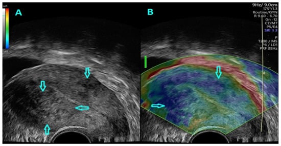 (A) B–mode, TVUS characteristics of uterine adenomyosis (superior part of the image) and a uterine fibroid (inferior part of the image) (pointed out through the arrows) (B) SRE evaluation of an image acquired through dual-mode, real–time TVUS which depicts coexisting adenomyosis and a uterine fibroid.