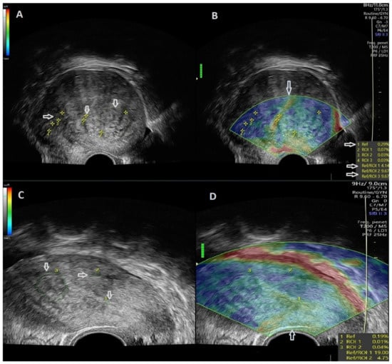 (A) Arrows depict ROI placement for comparative assessment of healthy, referral tissue with adenomyotic lesions (left side of the image) and a uterine fibroid (right side of the image). (B) SRE evaluation of an image acquired through dual-mode, real-time TVUS illustrating a uterine fibroid and adenomyosis. (C) Arrows depict ROI placement for comparative assessment of healthy, referral tissue and adenomyotic with adenomyotic lesions (superior part of the image) and uterine fibroid tissue (inferior part of the image). (D) SRE evaluation of an image acquired through dual-mode, real-time TVUS illustrating a uterine fibroid and adenomyosis.