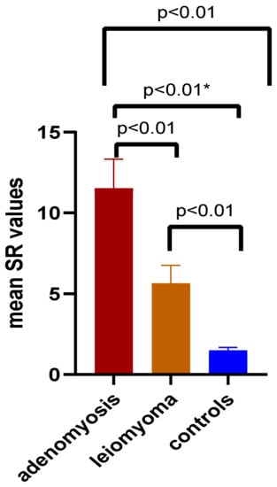 Comparison of mean SR values between adenomyotic, leiomyoma lesions and controls. Legend: SR—strain ratio; *—Mann–Whitney test was used (t test with Welch’s correction was used for other comparisons of two data sets).