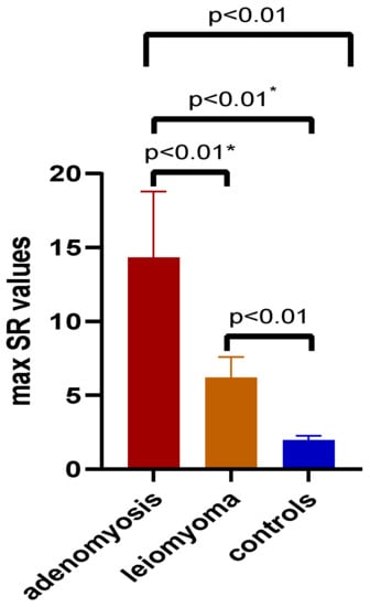 Mean SR and max SR values were obtained for both adenomyosis and leiomyoma lesions, as well as for normal uterine tissue, through shear-wave elastography. The comparisons of mean SR between adenomyosis, leiomyoma and controls are depicted in Figure 4. A significant increase (p < 0.01) was seen in mean SR values in both adenomyosis (11.52 ± 1.80 SD) and leiomyoma (5.63 ± 1.14 SD) lesions as opposed to controls (1.49 ± 0.18 SD). The highest mean SR values were identified among the adenomyotic lesions, the discrepancy being obvious not only in comparison to controls but also in comparison to leiomyoma (p < 0.01). Similar results were obtained with comparison of max SR values, as illustrated in Figure 5. The highest max SR values were identified among adenomyosis lesions (14.29 ± 4.49 SD), with important differences from leiomyoma (6.17 ± 1.41 SD) or controls (1.94 ± 0.30 SD).