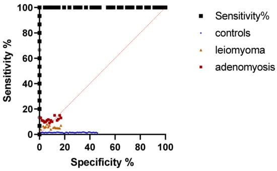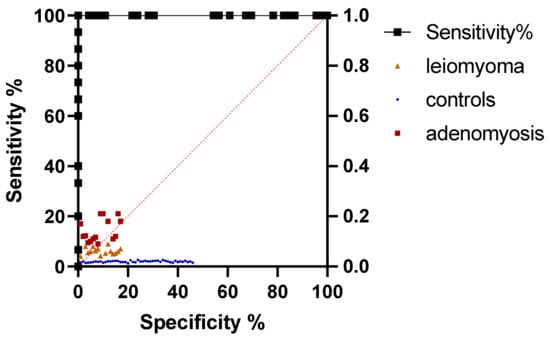 In the case of mean SR, after values of AUC of 1.00 for both adenomyoma and leiomyoma were obtained (p < 0.001). In the case of adenomyosis, a cut-off value of 5.42 was identified for mean SR (with a sensitivity and specificity of 100%). In the case of leiomyoma, a cut-off value of 2.85 was of the same sensitivity and specificity. For max SR, sensitivity and specificity of 100% were obtained for cut-off values of 5.80 for adenomyosis and 3.30 for leiomyoma. Values of AUC of 1.00 were also obtained for both max SR values. These results are depicted in Table 2 and Table 3. ROC curves for mean SR and max SR are illustrated in Figure 6 and Figure 7.