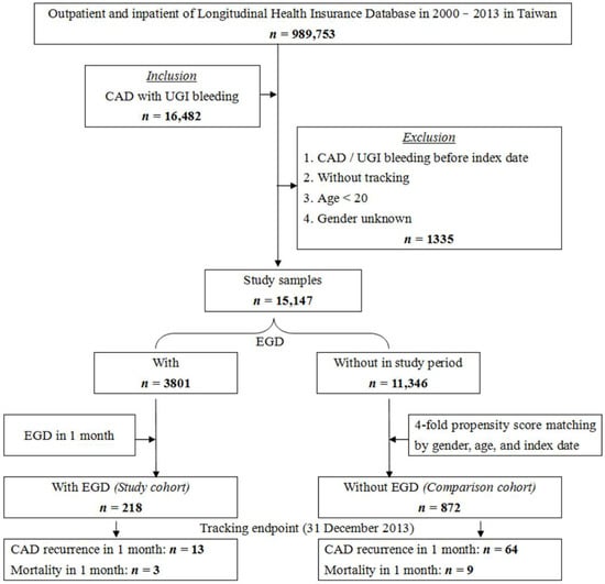 A retrospective cohort design was used, and we selected outpatient and inpatient data between 1 January 2000 and 31 December 2013 from the NHIRD in Taiwan. The selected patient cases had concurrent health problems such as cardiovascular accident (CAD) and (UGIB). The included case group defined CAD by ICD-9-CM 410–414 and UGIB by ICD-9-CM 53X.0, 53X.2, 53X.4, 53X.6 (X = 1–4), 535.X1. We excluded patients for whom CAD/UGIB diagnosis was performed before the index date and patients under 20 years old. We also excluded cases where diagnosis of CAD/UGIB was performed before 1 January 2000. Furthermore, we excluded cases with unknown gender.