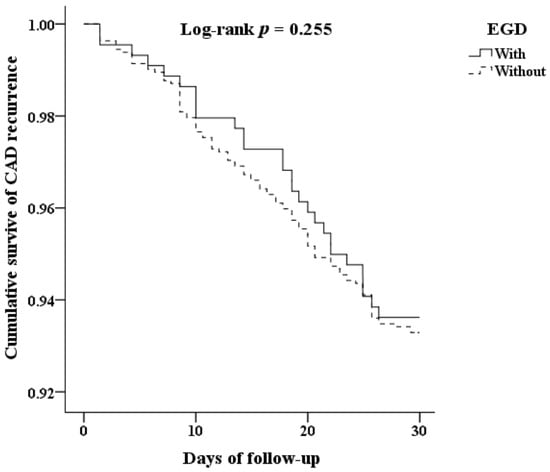The Kaplan–Meier survival curve was used to analyze the cumulative survival of CAD recurrence. It was demonstrated that patients who underwent EGD were not associated with a significantly increased CAD recurrence rate compared with the control (Log-rank test, p = 0.255) (Figure 2).