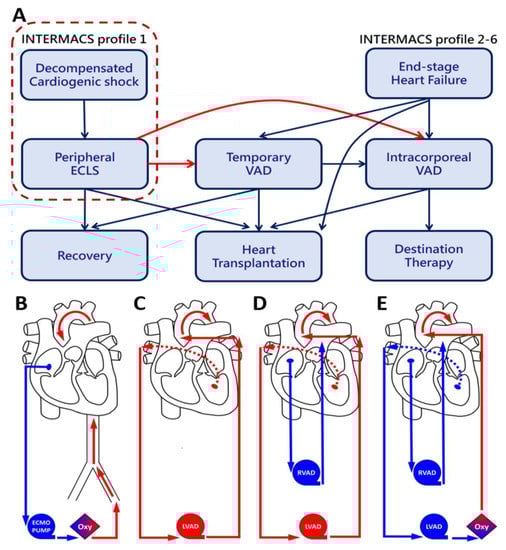 Treatment algorithm and device configurations. Each panel illustrates the blood flow direction of different configurations. (A) Treatment algorithm for acute cardiogenic shock and decompensated chronic heart failure according to different INTERMACS score and various clinical scenario. (B) Peripheral ECLS. ECLS Inflow: the deoxygenated blood (blue) comes from right atrium. ECLS Outflow: the oxygenated blood (red) flows into femoral artery. (C) Single LVAD. LVAD Inflow: the oxygenated blood (red) comes from left atrium or ventricle. LVAD Outflow: the oxygenated blood (red) flows into ascending aorta. (D) BiVAD without oxygenator spliced. Adding RVAD in configuration-C. RVAD Inflow: the deoxygenated blood (blue) comes from right atrium. RVAD Outflow: the deoxygenated blood (blue) flows into pulmonary artery. (E) BiVAD with oxygenator spliced. Adding oxygenator in configuration-D. ECLS, extracorporeal life support; INTERMACS, Interagency Registry for Mechanically Assisted Circulatory Support; LVAD, left ventricular assist device; RVAD, right ventricular assist device.