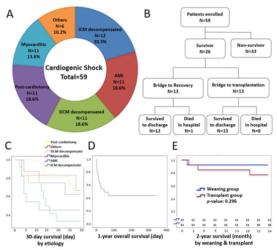 Patient destination and 30-day survival by etiology, 1-year overall survival, and 2-year survival in the weaning and transplant groups. (A) A pie chart depicting the etiology of cardiogenic shock. (B) A flow chart demonstrating the destinations of patients enrolled. (C) Survivals at 30 days were analyzed based on the etiology of cardiogenic shock. (D) Kaplan–Meier survival at one year was 40.6%. (E) The 2-year survival was 92.3% and 76.9% in the weaning and transplant groups, respectively.