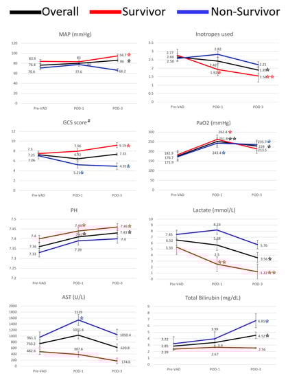 Improvement of hemodynamics and end-organ perfusion between the survivor and non-survivor groups. All POD-1 and POD-3 parameters were compared to pre-VAD (baseline) in the survivor subgroup, non-survivor subgroup, and overall group, respectively. Asterisks with different color represent the p-value in each corresponding group. * p-value < 0.05; ** p-value < 0.001. # All patients had endotracheal intubation with ventilator support. Thus, we were unable to assess verbal response. The GCS score only included eye opening and motor response. Verbal response was excluded in the scoring. VAD, ventricular assist device; POD, postoperative day; MAP, mean arterial pressure; GCS, Glasgow Coma Scale; PaO2, arterial oxygen tension; AST, aspartate aminotransferase.