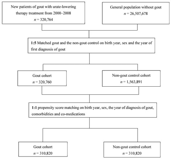 We identified a cohort of incident patients diagnosed with gout from 2000 to 2008 in Taiwan from the NHI database (the gout cohort) and followed them up until the end of 2018. Patients with gout received a primary diagnosis of gout (International Classification of Diseases, Ninth Revision, Clinical Modification [ICD-9-CM] code: 274). To avoid misclassification (e.g., cellulitis or monoarthritis for gout), patients had to have at least two outpatient visits for gout diagnosis and were prescribed urate-lowering agents (e.g., allopurinol, febuxostat, benzbromarone, probenecid, or sulfinpyrazone). The non-gout control group were patients without diagnosis of gout (ICD-9-CM code: 274) in principal, additional, or other diagnoses from 2000 to 2008. In order to have the two compatible cohorts, the non-gout cohort was first 5:1 matched according to birth year, sex, and the year of diagnosis of gout, because of the substantial number (n = 26,507,678) of beneficiaries in the NHI during this study period. Next, the non-gout control cohort was 1:1 propensity score matched according to birth year, sex, the year of diagnosis of gout, comorbidities, and co-medications within a caliper width equal to 0.2, the SD of the logit of the estimated propensity score [28]. The flow of patient selection is illustrated in Figure 1.