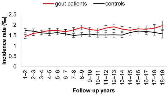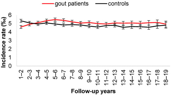 The two groups were followed from the index date until a stroke, death, or 31 December 2018, whichever occurred first. The incidence is the number of event occurrences divided by the total following person-year. A 2-year moving average of the stroke incidence rate was calculated to determine how the rate varied with time after the diagnosis of gout (index date). The 95% confidence interval (CI) of the incidence rate was based on the relationship between the F distribution and binomial distribution [32]. Cox’s proportional hazards model was used to obtain the hazard ratio (HR) with 95% (CIs) for stroke in the gout cohort, with the non-gout cohort as a reference group. Note that only the gout status vs. non-gout status was included in the Cox model because the two cohorts were compatible in demographics, comorbidities, and co-medications [33]. All statistical analyses were performed using SAS (version 9.4; SAS Institute, Cary, NC, USA).
