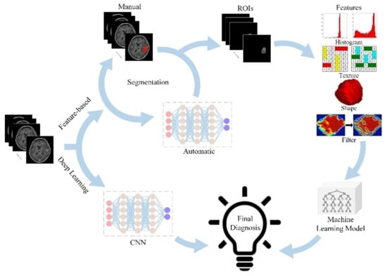 The concept of radiomics was first proposed by Dutch scholar Lambin in 2012 []. It is an emerging discipline that combines traditional radiology, big data analysis, and precision medicine, making use of radiomics features extracted from massive medical images data that can be recognized and quantified by computers, which truly realizes the leap from qualitative diagnosis to quantitative analysis of traditional radiology. Radiomics is a methodology to extract a large number of image-based features from standard medical images and then apply them to clinical decision supporting systems to assist diagnosis, assess prognosis, and predict treatment response, which plays an increasingly crucial role in addressing the issue of clinical oncology research []. Figure 1 shows the general framework for radiomics.