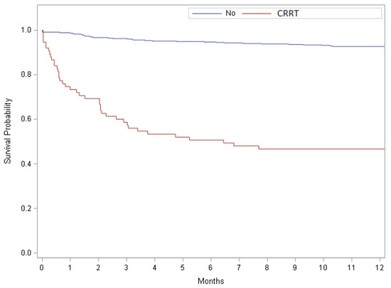 Overall, at the one-year follow-up, 73 of the 528 patients had died. As shown by the Kaplan–Meier curve (log-rank p value < 0.01), survival in the week immediately following transplantation favored the group without CRRT (Figure 1).