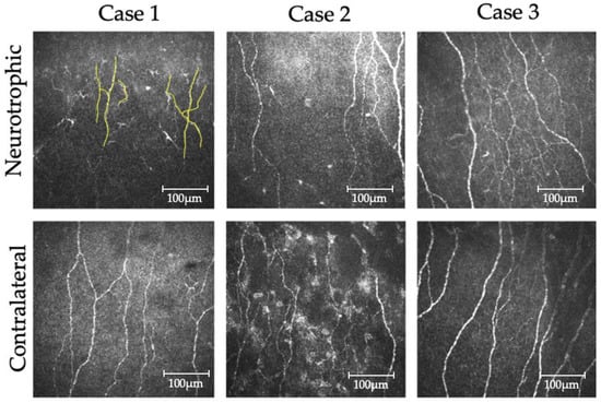 Sub-basal nerve plexus assessed by in vivo confocal microscopy. The upper panels show the neurotrophic cornea, and the lower panels show the contralateral cornea. We traced all nerve fibers (yellow line) and determined the mean density of the sub-basal nerve plexus using five photographs in each patient. Note that there was a significant decrease in nerve fiber density in the neurotrophic eye.