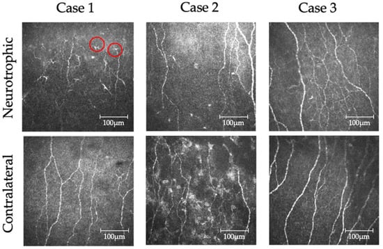 Corresponding to the decrease in corneal perception using the Cochet–Bonnet corneal anesthesiometer, the density of the corneal trigeminal nerve was significantly lower in the affected eye than in the contralateral eye. This was supported by the IVCM findings. The decrease in nerve fiber density in Case 3 (3198 μm/mm2), which had a relatively short post-onset period, was lower than that in Cases 1 and 2 (1032 μm/mm2, 1600 μm/mm2, respectively), both of whom had a longer history of trigeminal neuropathy. This indicates that long-term neuropathy leads to morphological changes in nerves over time. Since there was no history of epithelial erosion in Case 3, the effects of neuropathy may be influenced by the duration of neuropathy.