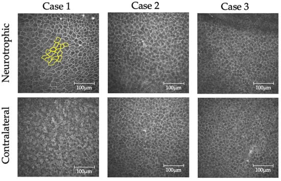 Observation of basal cells by in vivo confocal microscopy. Fifteen cells per photo were randomly selected and marked, and the mean cell size was determined from five photographs in each patient using Image J. Note the larger size of the basal cells in neurotrophic corneas than in contralateral corneas.