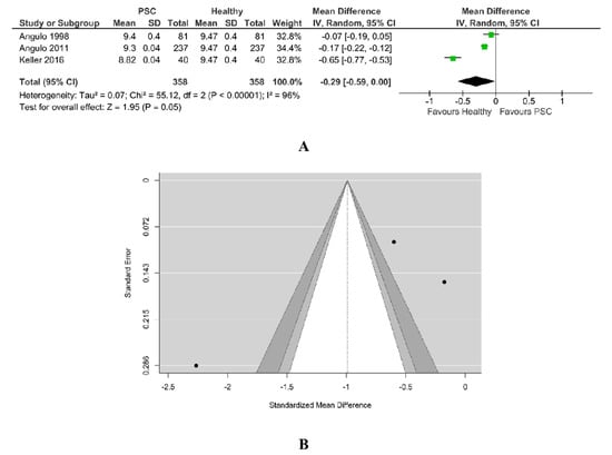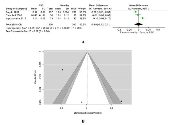 Figure 2. (A) Forest plot assuming a random-effects model for BMD-LS PSC vs. Healthy. (B) Funnel plot demonstrating publication bias assessment in model for BMD-LS PSC vs. Healthy [18,19,34].
